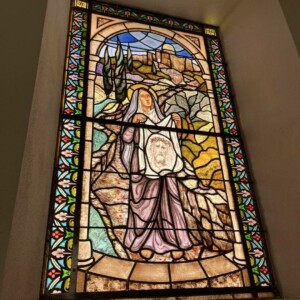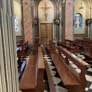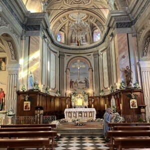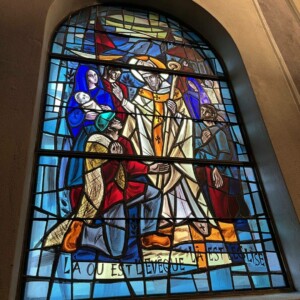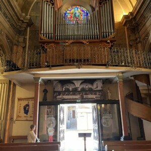 In contrast, entering the edifice offers the discovery of an incredibly well-preserved church! And quite modern, though. As somebody accustomed to old churches lacking renovations (or simply electricity), I was surprised to pass threw an automatic door and witness some religious representations on screens. I will not hide that I prefer the good old painting, but have to admit that you feel in this church a wish for preservation. Anyway, the interest lies in the paintings, in trompe l’oeil for most of them, and the various representations of Christianity on stained glass. The ensemble retains a certain sobriety and at the same time a great sense of equilibrium. Above the front door, on the opposite side of the choir stands the organ. A nice church in short, impressive for its perfect maintenance.