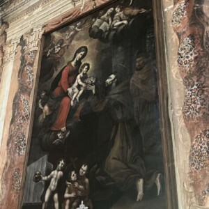 Inside the church of the Convent of Alesani, Baroque art is evident everywhere. The sixteenth-century roof structure has been replaced by barrel vaults. The monumental paintings combine trompe-l’œil geometric shapes, floral ornaments, false drapery, and various representations. Such as the Flight into Egypt, the Adoration of the Magi, and the symbols of the Litany of the Virgin. Those paintings were realized over several periods. The oldest, which can still be seen in part in the side altars of the choir, dates from the early 18th century. Another campaign took place in the following decades. But it was mainly during the second half of the 19th century that the church of the Alesani Convent was almost entirely repainted.